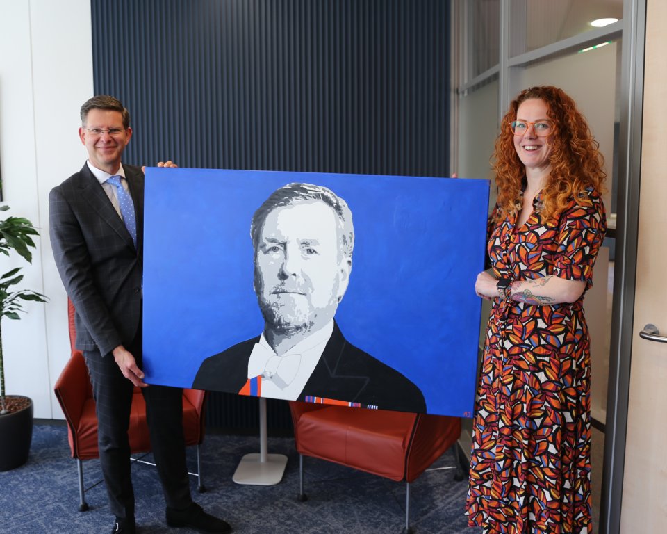 De gemeente heeft een nieuw portret van Koning Willem-Alexander ontvangen. Het schilderij is gemaakt door Anne de Jong uit Oosterwolde en is vandaag door haar overhandigd aan burgemeester Jack Werkman. Het werk krijgt een mooie plek in de vernieuwde raadzaal.