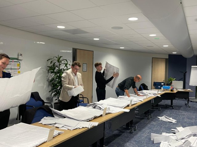 We zijn begonnen met het tellen van de stemmen! De zorgvuldig opgevouwen stembiljetten worden nu weer uit elkaar geklapt en gecontroleerd. We tellen nu alleen de stemmen op partijniveau. Morgen tellen we de stemmen per partij en kandidaat.