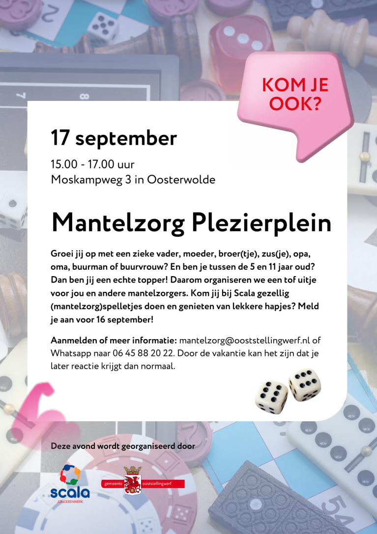 Groei jij op met een zieke vader, moeder, broer(tje), zus(je), opa, oma, buurman of buurvrouw? En ben je tussen de 5 en 11 jaar oud? Dan ben jij een echte topper! Daarom organiseren we een tof uitje voor jou en andere mantelzorgers. Kom jij bij Scala gezellig (mantelzorg)spelletjes doen en genieten van lekkere hapjes? Meld je aan voor 16 september!