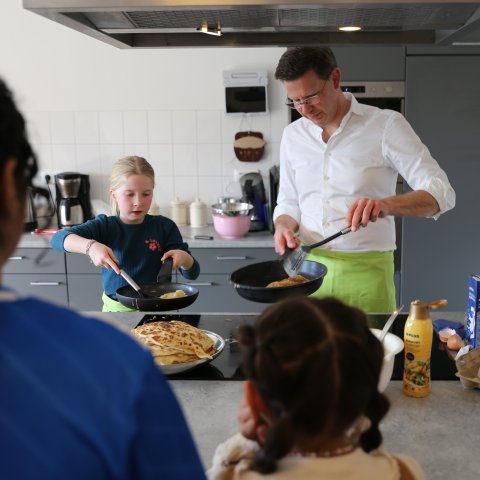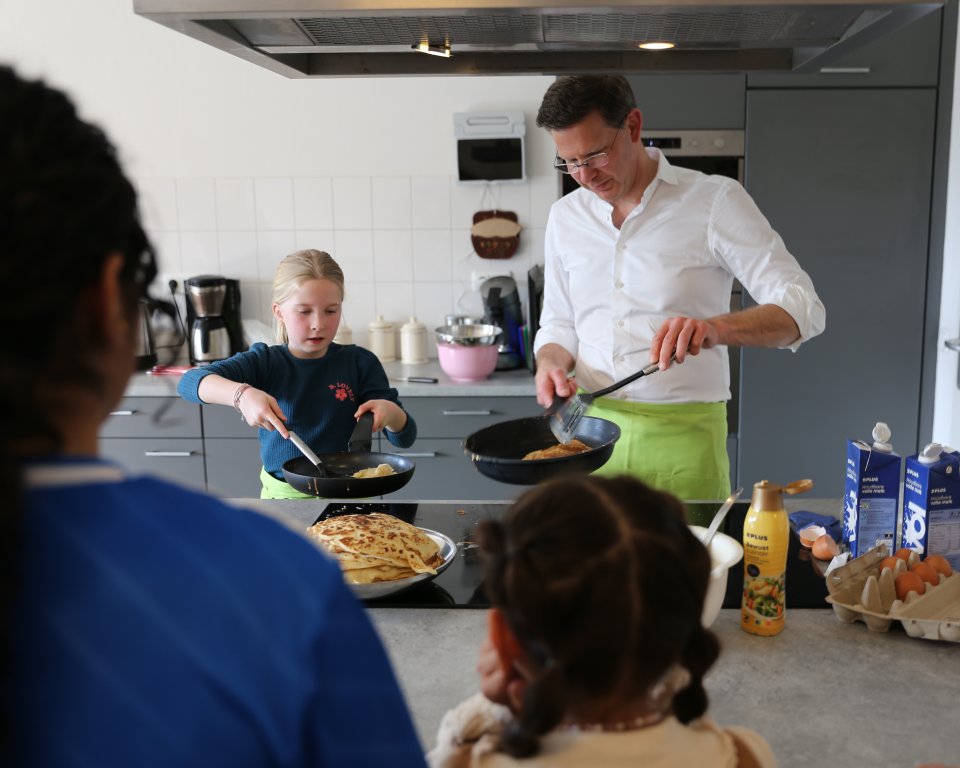 Tijdens Nationale Pannenkoekendag stond ontmoeting en gezelligheid centraal in woonzorgcentrum Rikkingahof. Burgemeester Jack Werkman en kinderburgemeester Floor bakten daar samen met kinderen uit de tijdelijke opvang voor statushouders, gevestigd in het naastgelegen oude zorgdeel van Rikkingahof, pannenkoeken voor de oudere bewoners.