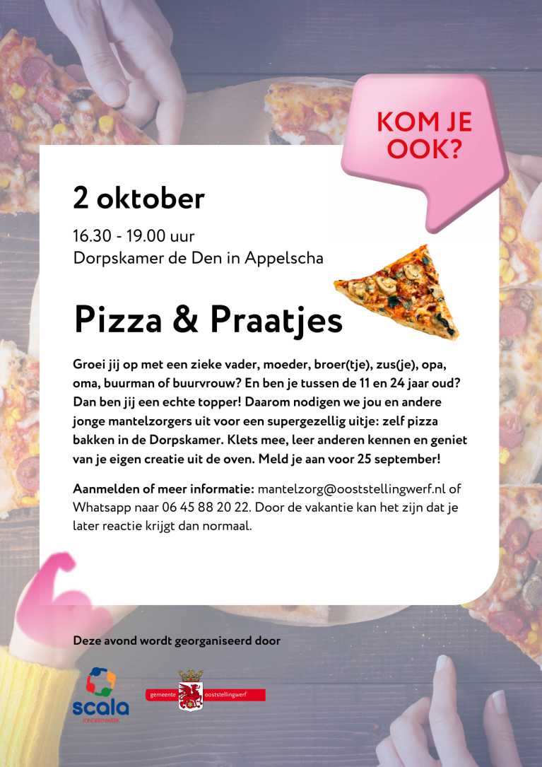 Groei jij op met een zieke vader, moeder, broer(tje), zus(je), opa, oma, buurman of buurvrouw? En ben je tussen de 11 en 24 jaar oud? Dan ben jij een echte topper! Daarom nodigen we jou en andere jonge mantelzorgers uit voor een supergezellig uitje: zelf pizza bakken in de Dorpskamer. Klets mee, leer anderen kennen en geniet van je eigen creatie uit de oven. Meld je aan voor 25 september!