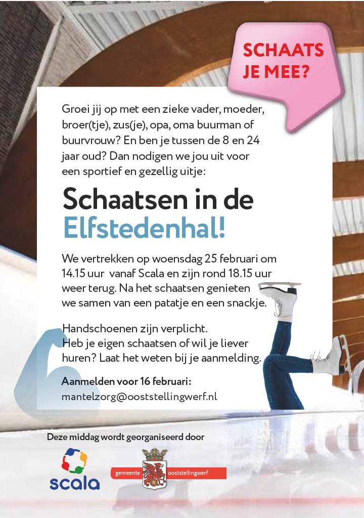 Groei jij op met een zieke vader, moeder, broer(tje), zus(je), opa, oma, buurman of buurvrouw? En ben je tussen de 8 en 24 jaar oud? Dan nodigen we jou uit voor een sportief en gezellig uitje: Schaatsen in de Elfstedenhal!